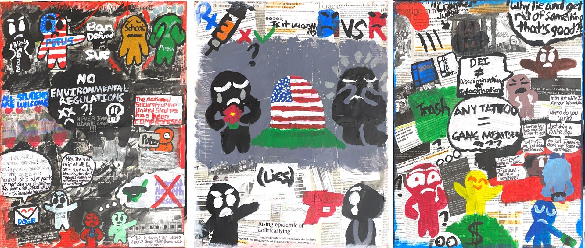 What is America to U.S.?— is intended as a critique of current and past instances of our country going backwards from morals and its founding values (liberty, equality, etc.). In isolated scenes of gingerbread-esque people experiencing different real-world issues such as healthcare inequality, racism, negative politicization of civil rights (opposing the right to gay marriage, banning DEI, banning LGBTQ+ protections, etc.), economic inequality, and more. They were painted in that style for time conservation (as part of a college class project) while also to not cover up the newspaper clippings that pointed these topics out. I will apologize ahead of time if this offends anyone in any way, given our current political climate. I had no intention of doing that to anyone and only made this artwork to point out the issues present in our society.