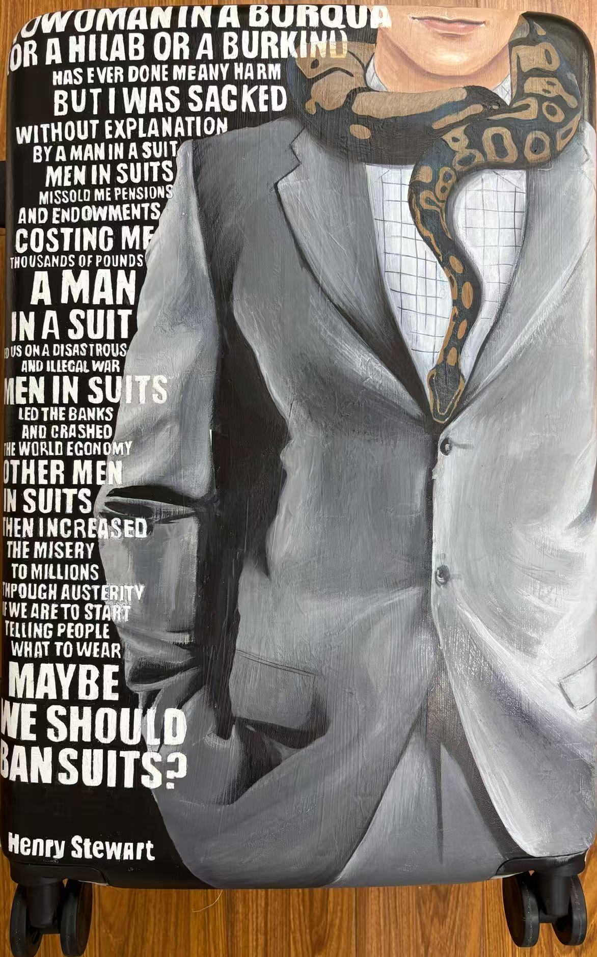 What is America to U.S.?— is intended as a critique of current and past instances of our country going backwards from morals and its founding values (liberty, equality, etc.). In isolated scenes of gingerbread-esque people experiencing different real-world issues such as healthcare inequality, racism, negative politicization of civil rights (opposing the right to gay marriage, banning DEI, banning LGBTQ+ protections, etc.), economic inequality, and more. They were painted in that style for time conservation (as part of a college class project) while also to not cover up the newspaper clippings that pointed these topics out. I will apologize ahead of time if this offends anyone in any way, given our current political climate. I had no intention of doing that to anyone and only made this artwork to point out the issues present in our society.